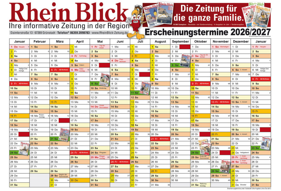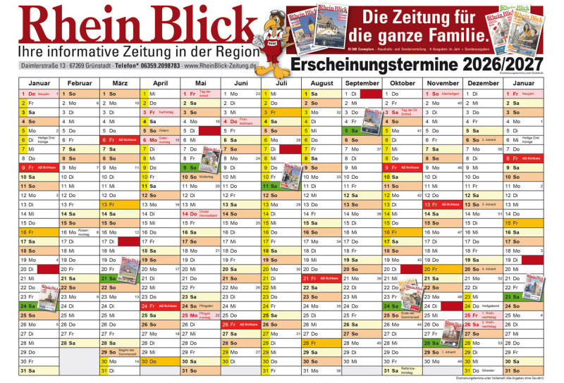 Die RheinBlick-Zeitung ist eine kostenlose und informative Zeitung mit einer Auflage von 81.500 Exemplaren pro Ausgabe. Wir wollen uns an die Leser und Gewerbetreibenden der Vorderpfalz wenden, um so die Regionen Frankenthal/Pfalz, Bad Dürkheim, Grünstadt, Eisenberg und auch die umliegenden Städte und Gemeinden zu verbinden. Mit dem RheinBlick wird man mit aktuellen Berichten und feststehenden Themen auf dem Laufenden gehalten. Es ist die Zeitung für die ganze Familie, selbst Rätselfreunde werden mit ein wenig Glück mit besonderen Preisen belohnt.